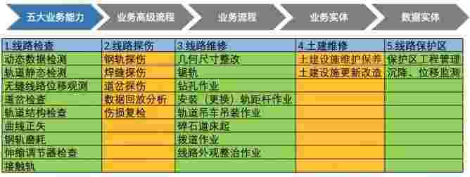 在轨道运维业务中,,,,,,,,,,我们形成了完整的从业务能力(业务域)-业务流程-业务实体-数据模型的分析梳理过程。。。。。轨道运维业务能力如下图所示::::::